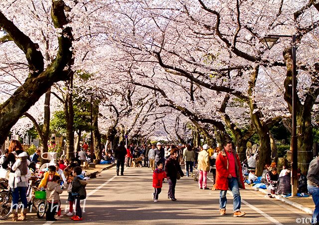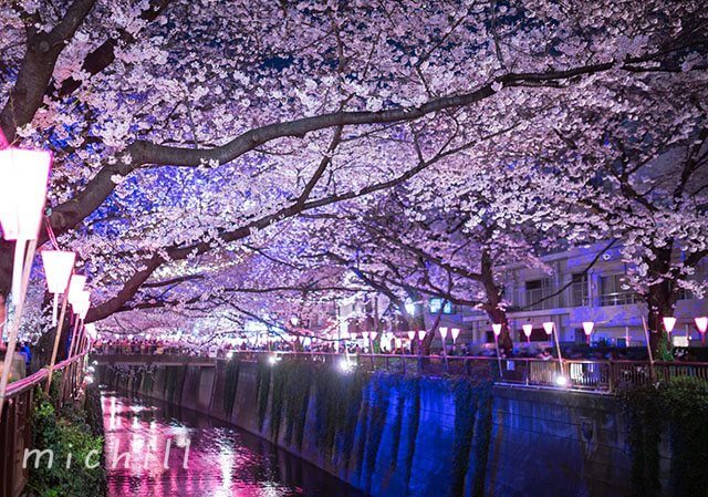 世田谷区・目黒区・品川区を流れ、東京湾へと続く目黒川。川に沿って植えられた、800本もの桜が織りなす光景は優美そのものです。全長8kmある目黒川のうち、世田谷区にある池尻大橋駅付近の大橋から、目黒区の太鼓橋付近までの約3.8kmの区間が花見スポットの核。「中目黒 桜まつり」(4月2日日曜日)中は桜のライトアップをはじめ、露店や屋台なども並びます。