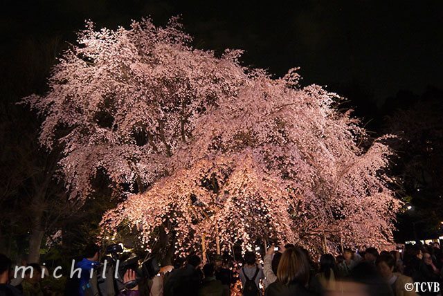 国の特別名勝に指定されている六義園は、和歌の浦の景勝や『古今和歌集』に詠まれた日本の名勝を八十八境として取り入れた庭園です。複数種の桜が見られますが、ここの魅力はなんといってもしだれ桜。3月下旬になると満開を迎える、庭園中心部のしだれ桜はまるで流れ落ちる滝のよう。暗闇に映える夜桜も21:00まで見物できます(最終入園は20:30)。