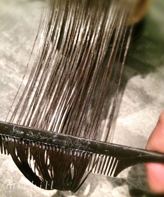 一本一本にトリートメントを馴染ませるためにコームでとかす