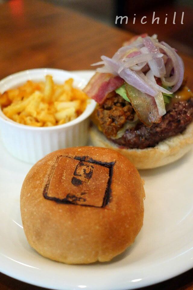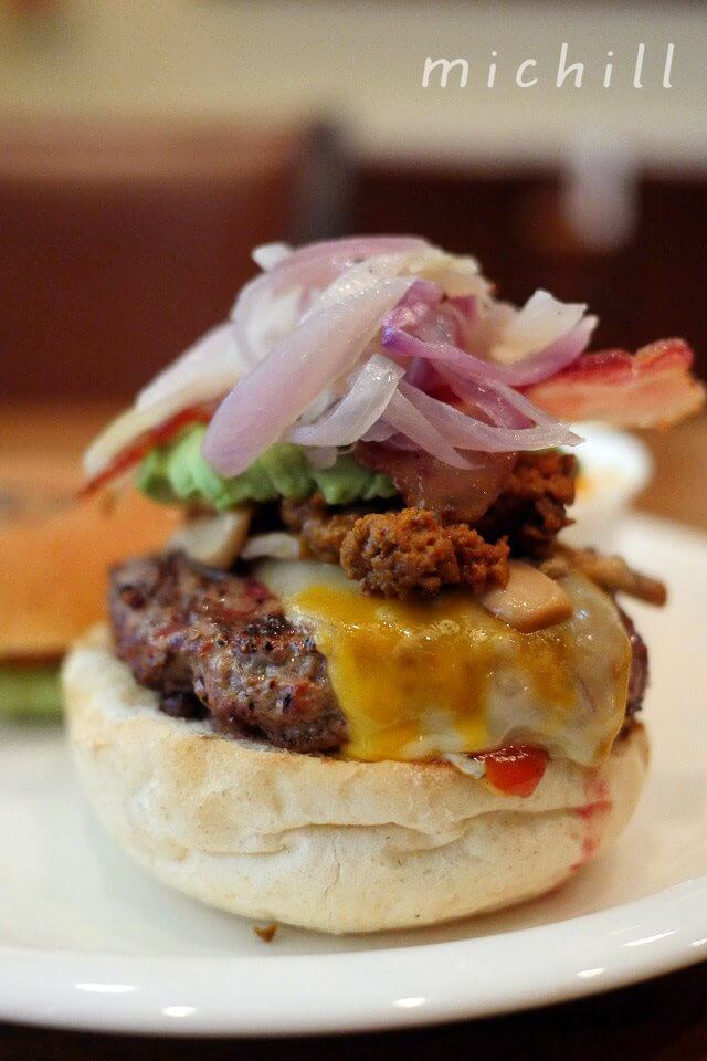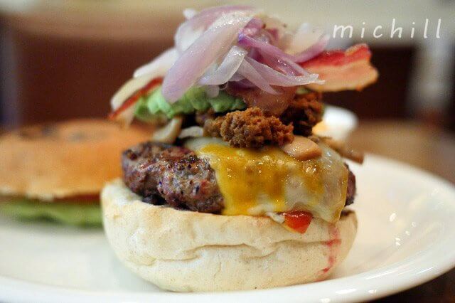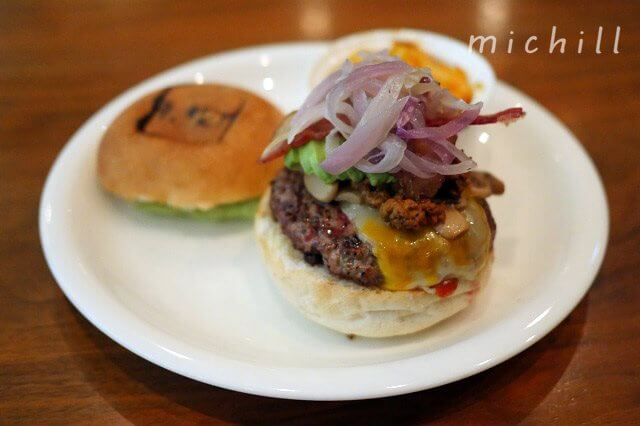 今回、オーダーしたのは名物バーガー「摩天楼」。トッピングは、タマネギ、ベーコン、チリ、マッシュルーム、アボカド、チェダーチーズ、ゴーダチーズと盛りだくさんで、オマケにサイドディッシュも付いています。