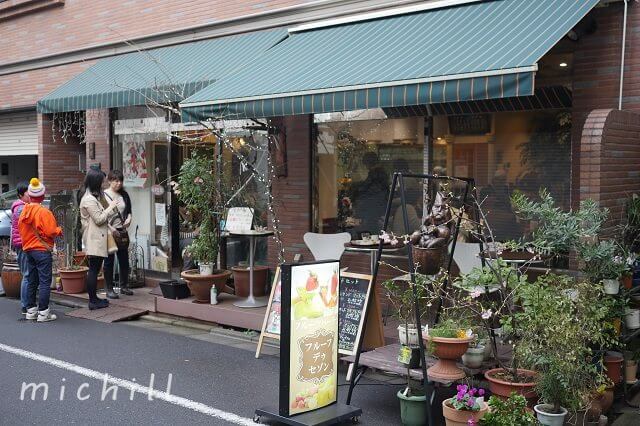 大通りからすこし外れた、静かな路地に立つ「フルーフ・デゥ・セゾン」。築地・大田市場から直送の新鮮なフルーツを味わえるフルーツパーラーで、自慢はもちろんフレッシュフルーツと焼き立てパンです。