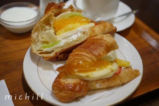 なかでも注目は、ちょっと小腹がすいたときにぴったりの「クロワッサンサンドイッチ」。中の具材をハム、ツナ、フルーツの3種類から選べるのですが、今回は迷わずフルーツをチョイス。