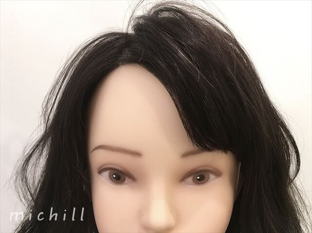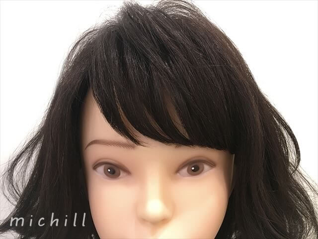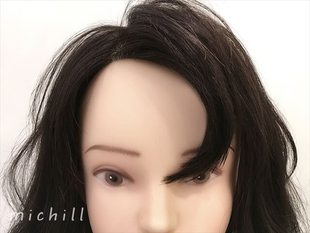 上の写真を撮ってから、前髪の根元をグイッと横に流れるようにして下の写真を撮りました。