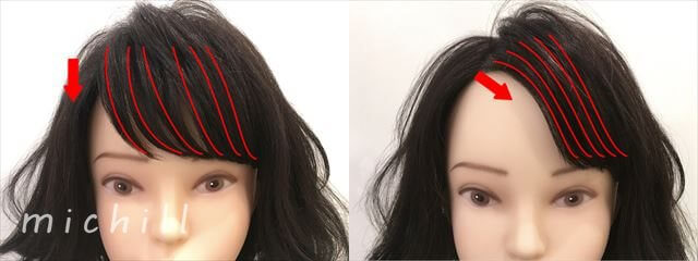 よく見てみると作ろうとしていた画像左のような前髪って、毛先は横に流れているけど根元は下に向いています。