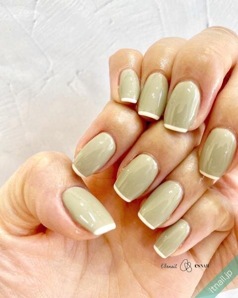 まずご紹介するのは、オシャレなピスタチオカラーのベースネイルに、ホワイトのフレンチラインをかけ合わせたフレンチネイルです。爪先の細いラインがデザインに引き締まった印象を演出し、ナチュラルかつスタイリッシュな雰囲気に仕上がっていますね。