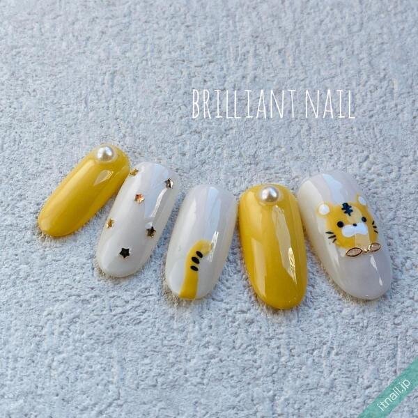 こちらのデザインは、コロンとした丸みがキュートなイラスト入りの干支ネイルです。トラの愛らしい表情とやわらかいタッチのアートが手元をほっこり魅せてくれますね。トラのしっぽを3Dアートで立体的にして、遊び心をもたせるのも◎トラのしっぽで楽しい動きも感じられますね♡お色をホワイトとイエローでシンプルにまとめてバランスの取れたネイルに仕上がっています。