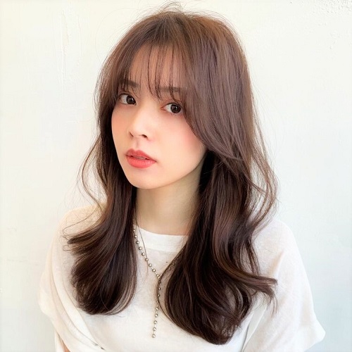 レイヤー×外巻きで韓国風に仕上げたロングヘアは、シースルーバングで透け感を作ると春っぽい顔映りに。