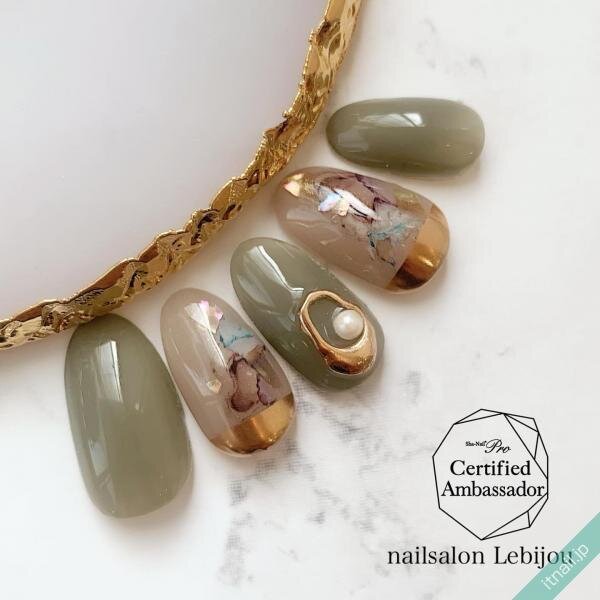 スモーキーな淡いオリーブグリーンと、ブラウンやブルーの滲みネイルを合わせたデザイン。滲みネイルの根元にはゴールドミラーを使い、パキッとしたアクセントが特徴的です。落ち着いた色合いの中から広がるゴージャス感がたまらないですね。