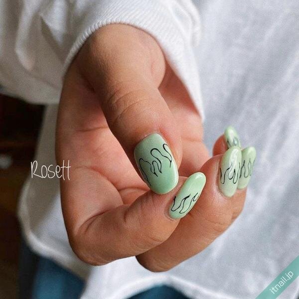 グリーンのワンカラーに、炎のモチーフを描いたラインアートもカッコいいです。太めのラインアートで描いてしまうと、あまりにも「ザ・炎」という感じの存在感のあるアートになってしまいます。そのため、できるだけ細くしなやかなラインになるように描いてみましょう。
