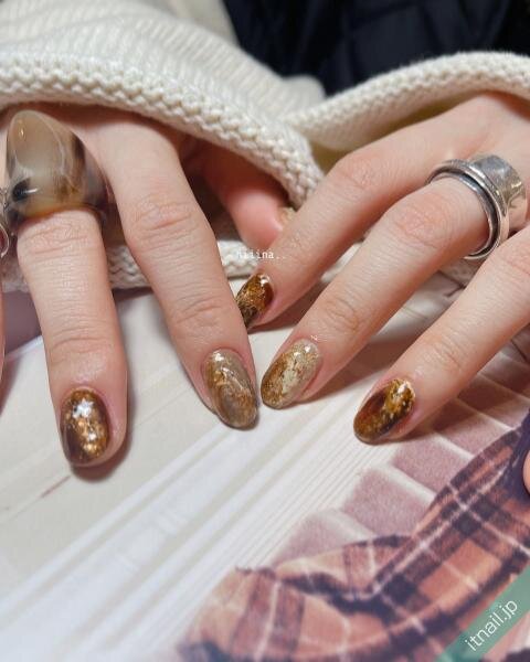 こちらは、シアーブラウンのタイダイ柄にほんのりゴールドや乳白色を混ぜ合わせたニュアンスネイル。