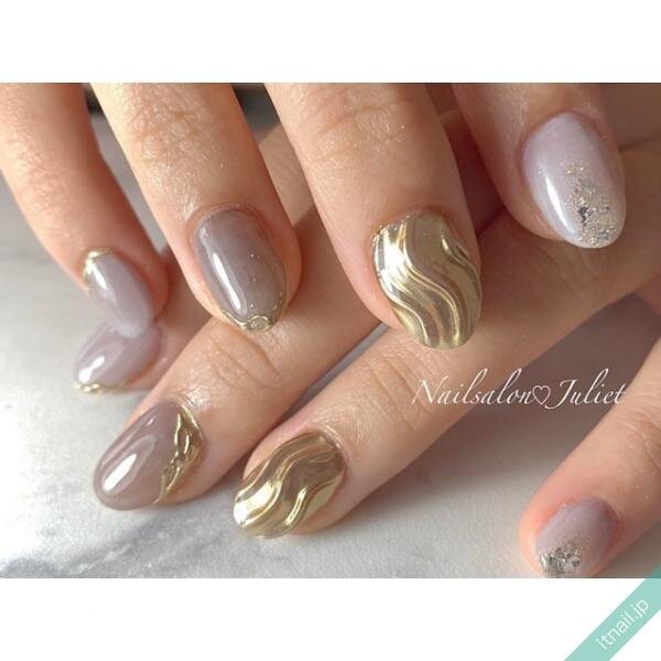 うねうねとしたゴールドのミラーネイルにベージュのワンカラーを合わせてみてください。ベージュのワンカラーの先端や根元にもゴールドを入れると、デザイン全体にまとまり感が出せます。スタイリッシュでオシャレなネイルですね。
