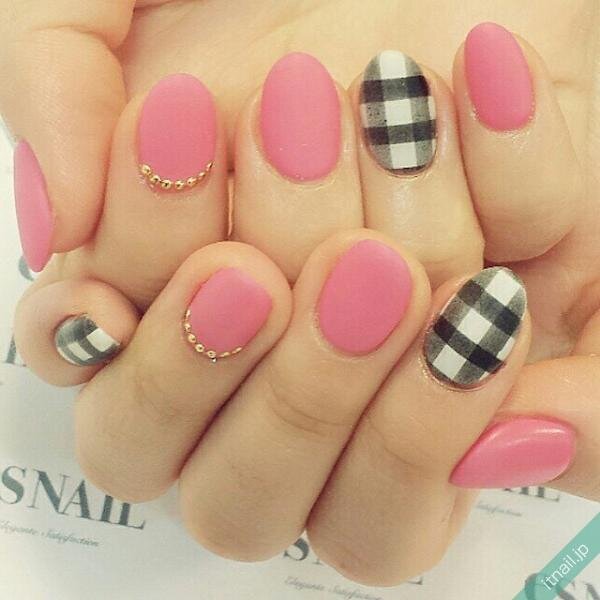 キュートなギンガムチェックネイルの良さを残したい人は、ブラック×ホワイトのギンガムチェックにピンクのワンカラ―を合わせてみましょう。普通のピンクだとかわいらしくなり過ぎてしまうので、マット仕上げにしてツヤを消します。落ち着いた雰囲気になりますよ。