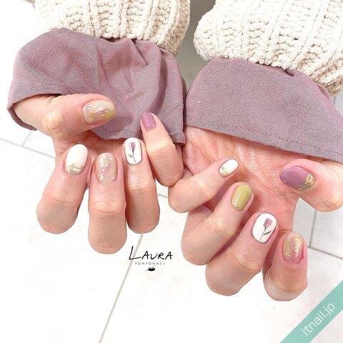 キュートなイメージが強いチューリップネイルですが、大人向けのデザインはたくさんありますよ♪特にくすみカラーを使ったチューリップネイルは、大人可愛く仕上がりやすいのでおすすめです。一輪挿しのデザインも、大人っぽく見せてくれます。