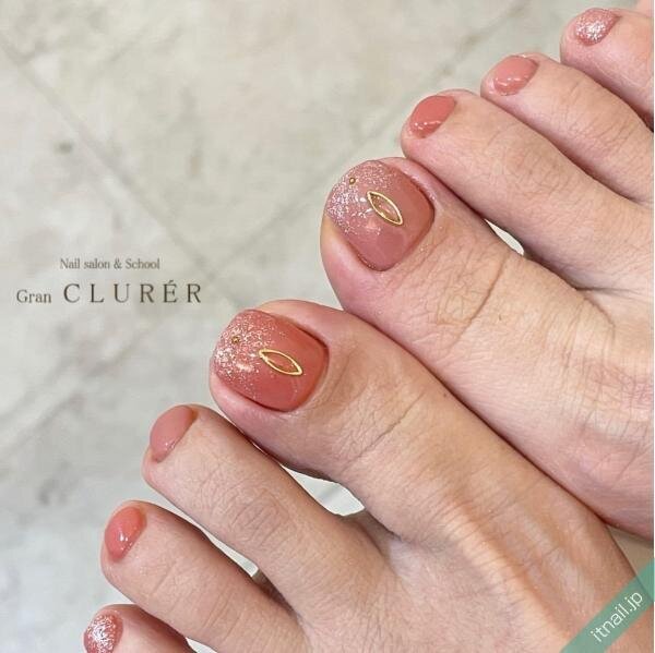 続いてご紹介するのも、かわいらしくこっくりと色づいた春ピンクのフットネイルです。こちらは爪先にグリッターの輝きを施してアクセントに。縦長のゴールドパーツも、足元に洗練された印象を演出してくれます。