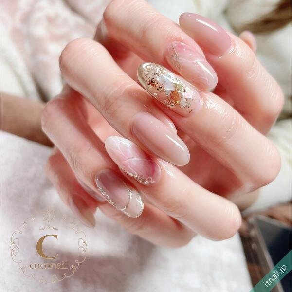 透明感を意識したライトな印象のニュアンスネイル。シェルやラメを所々に散りばめて上品ながら輝きのあるデザインに。肌馴染みのいいカラーのお陰で、いろんなアートを盛り込んでいるのに派手になりすぎないのがいいですね。