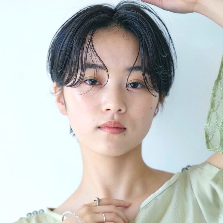 面長さんは縦長の輪郭が特徴のため、その部分をカバーするために前髪ありの黒髪ショートがおすすめです。