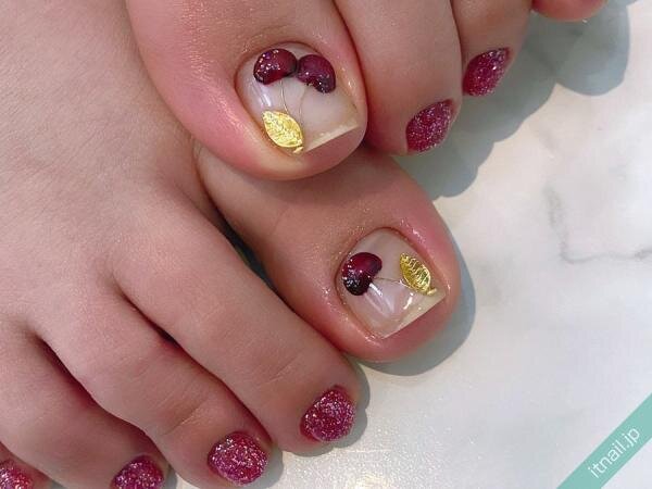 フットネイルでも、ダークカラーのさくらんぼが大人気♡熟したような深い色が大人っぽくて可愛いですよね。クリアネイルをベースに、ぷっくりチェリーを引き立てましょう!ザラザラしたシュガーネイルと合わせても可愛いです。