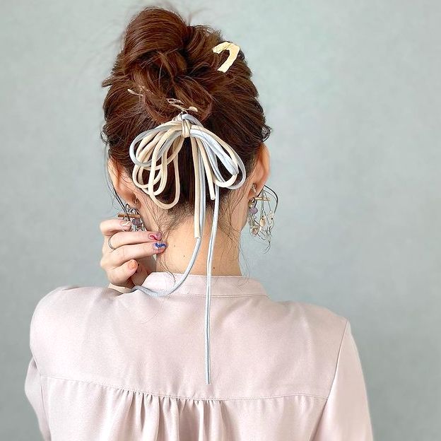 三つ編みしてから紐を巻き付けていくことで、おしゃれ度の高いまとめ髪に仕上がっていますね。
