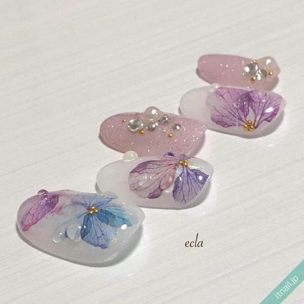 乳白色をベースに、ブルーとパープルの大きめの押し花を乗せます。その上に、雫アートを施せば、雨に濡れた美しい花をリアルに再現することが可能です。中指と小指は、ピンク×ラメのワンカラ―にして、ストーンやパールを乗せましょう。女性らしく優美なデザインから目が離せませんね♡