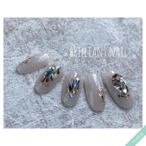 お洒落な人に人気のくすみカラー【グレージュ】には、ブルーやグリーンの寒色系のシェルを使って、クールな装いに。少し暖かみも加えたいのでゴールドのホログラムで華やかに。全体的には沢山のシェルやホロを使っていますが、ベースがグレージュなので落ち着いた印象に仕上がっています。