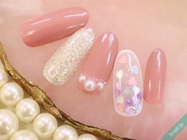 まるで韓国の”ハートシェイカー”みたいなデザインがこのネイルの主役。ピンクやパープルなどカラフルな♡をクリアベースの上に飾って、ときめくデザインに仕上げましょう♡ピンクの色味が落ち着いているから、大粒のパールやラメなど華のあるデザインも加えて、全体的にガーリーさ強めにまとめてみて!