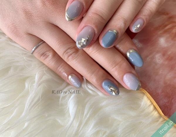 メタリックやくすみブルー、ブルーの天然石アートと様々なブルーを使った欲張りなデザイン。いろいろなデザインを取り入れても落ち着きのあるブルーがベースなので、大人っぽくまとまっています。アクセサリーいらずのデザインに気分も上がります。
