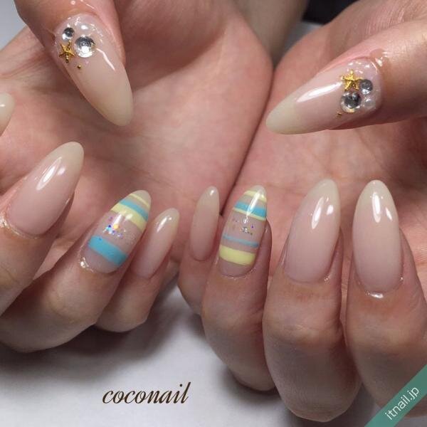 ボーダーの合間にラメがあしらわれているのも見逃せません。親指の根元にはラインストーンやヒトデのゴールドパーツが配置されていて、夏らしさを感じます。