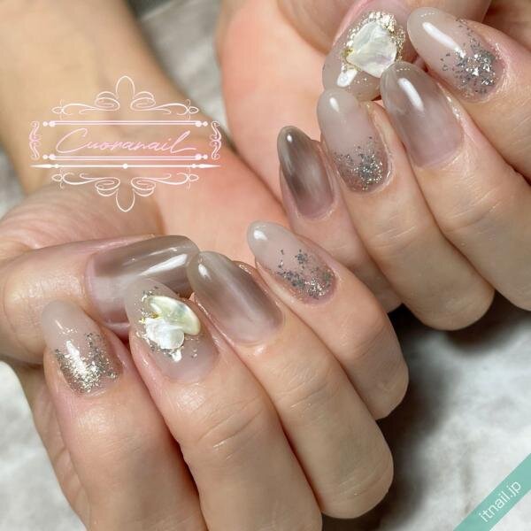 レディな印象のピンクベージュに、先端にシェルを取り入れたこちらのネイル。淡く優しい色合いとほのかに輝くシェルが、品のある女性に似合います。