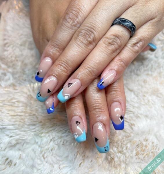 クリアベースで涼しげなブルーを使ったフレンチデザイン。全体に幾何学模様を施すのではなく、ポイントとしてさりげなく柄を入れているのが今っぽいですね!ニュアンス感や抜け感も感じられるトレンドデザインです。