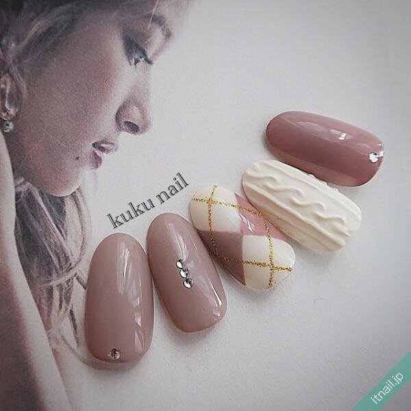 ホワイト×ベージュのアーガイルネイルに、ホワイトのニットネイルを組み合わせたアートは秋らしいです。ほっこりとしたあたたかみがありますね。親指、人差し指、小指はベージュのワンカラ―にして、小さなクリアストーンを乗せましょう。