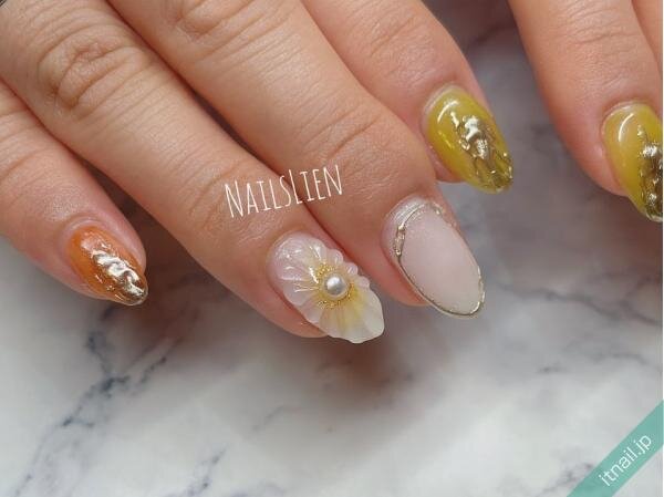 秋色のマスタードイエローや、テラコッタカラーを差し色にしたぷっくりクリアのフラワーネイルも可愛いですよ♡差し色にはミラーアートを入れて、ニュアンス感を出すのがおすすめです。可憐な雰囲気も漂う初秋ネイルの完成!