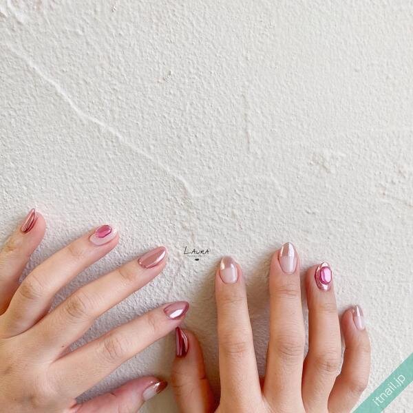 ピンクミラーといっても、濃い色や淡い色などいろいろあるので、アシメデザインを作る上で違う色を取り入れてみて!色味を変えるだけで、こなれ感のあるピンクミラーネイルが楽しめて、飽きのこない指先になります♡