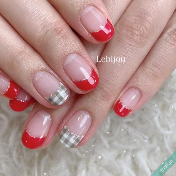 赤のチェックがアクセントとなったデザイン。ピンクがかったオフホワイトのワンカラーに、ラインテープでチェック柄のアートをして可愛らしく。ワンポイントなので、飽きにくいです。秋はチェック柄も人気ですが、一味違ったアートをしたいという方はトライしてみて。