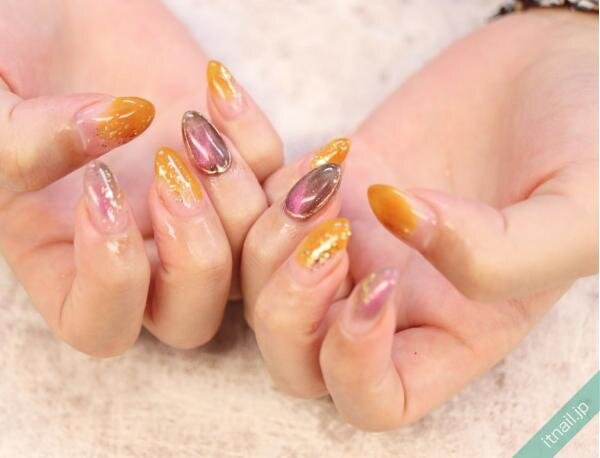 透け感のあるオレンジやパープルは、指先に柔らかく馴染んでくれるので、初めての方にもおすすめの組み合わせです♪ちゅるんとした仕上がりで、重く見えないようにするのがポイント!ラメやミラーアートで特別感を出してみてください。