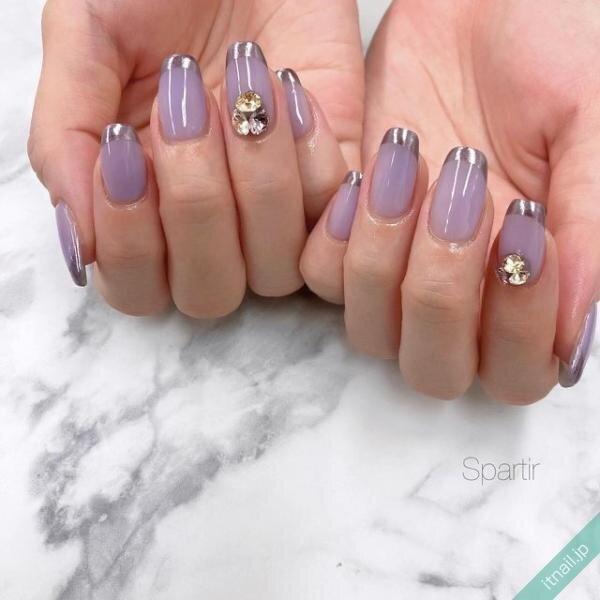 青みパープルと相性抜群なシルバーを爪先に取り入れて、洗練されたネイルデザインを作ります。ミラーフレンチにすれば、フレンチネイルも一味違った雰囲気に。爪は長めのスクエア型にして、甘さは控えめにしておきましょう。大粒のビジューも良い存在感を放っています。