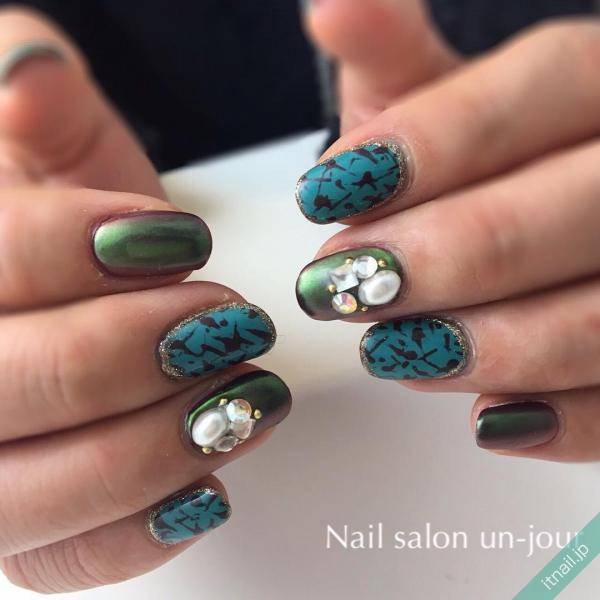 黒に近い見え方やアンティーク調のオリーブグリーンに見える玉虫色の存在感を持ってすれば、大抵のハードなデザインも意外としっくりネイルに落とし込む事が出来ます。