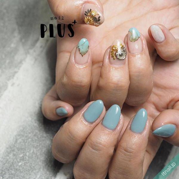 例えば、おしゃれに見えるアシンメトリーデザインはいかがでしょうか?流行の天然石風ネイルとゴールドパーツを使ったアートは、どことなくエスニックな雰囲気を漂わせる夏向けデザイン。反対の手はくすみブルーのワンカラーでシンプルにきめると、センスのよいネイルになりますよ。