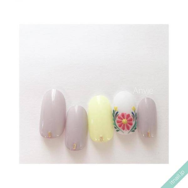 エンブロイダリーネイルにはさまざまなデザインバリエーションがありますが、上品に仕上げたい場合は、爪1本だけにエンブロイダリーアートを施すネイルをおすすめします。シンプルにカラーリングしたネイルをベースに1本だけにエンブロイダリーアートを施すデザインならば、オフィスシーンでも使いやすいネイルに仕上げられますよ♪