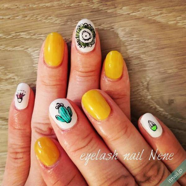 そんなサボテンモチーフ、手描きイラスト風にデザインすればかわいい印象に。元気なイエローとあわせて指先から明るく。