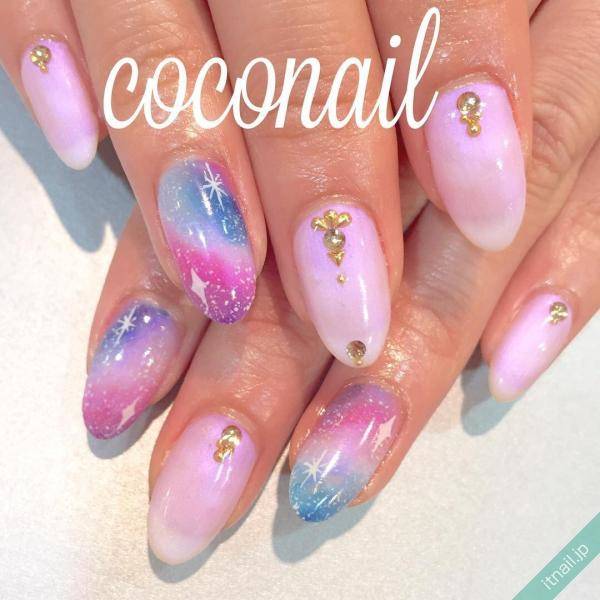 ギャラクシーネイルというと、上でご紹介したような深みのあるカラーを使ったデザインが一般的ですよね。ただ、ダークブルーのような濃い色を基調としたデザインは主張が強そうで勇気が出ない、という方もいらっしゃると思います。
