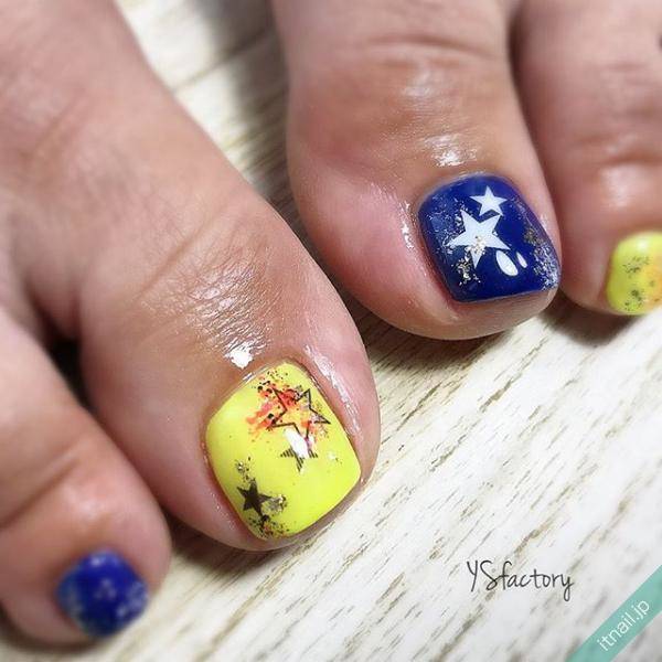 ブルーネイルにはホワイトのスター、イエローネイルにはゴールドのスターと2つのスター柄を楽しめる贅沢なデザインです。