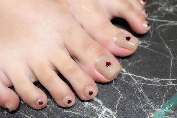 例えば、スキンカラーでカラーリングしたネイルの中央に、鮮やかレッドのストーンを1粒、あるいはホログラムを1枚ONするデザインはいかがでしょうか。肌によく馴染む上品なフットネイルに鮮やか色味が映える、お洒落度高めなネイルが完成しますよ♪