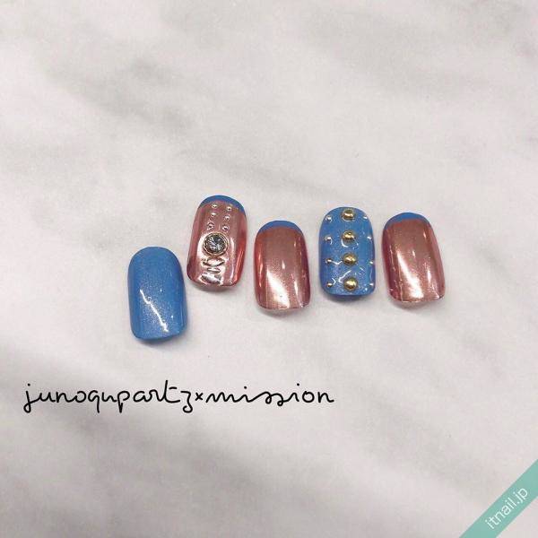 シンプルにカラーリングしたネイルを基本として、爪数本だけをミラーネイル×スタッズラインネイルにすると、より上品な仕上がりを楽しめますよ♪