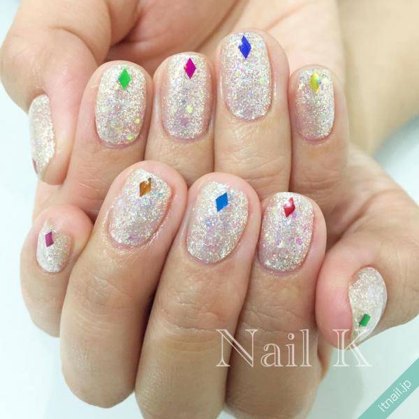 例えば、ベースはあえてシンプルなデザインにして、その爪先にカラフルなダイヤ型スタッズをONするデザインはいかがでしょうか。5本すべてに同じ色のスタッズを配置してもいいですし、それぞれの爪に乗せるスタッズの色を全て変えてみてもいいでしょう。