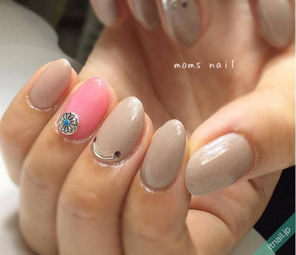 そんなコンチョを取り入れたネイルとしてまずご紹介したいのが、上品カラーを使ったシンプルネイルにコンチョのポイントアートをプラスするデザインです。ブリオンやストーンを使ったデザインとはひと味違う、個性豊かなネイルに仕上がりますよ♪
