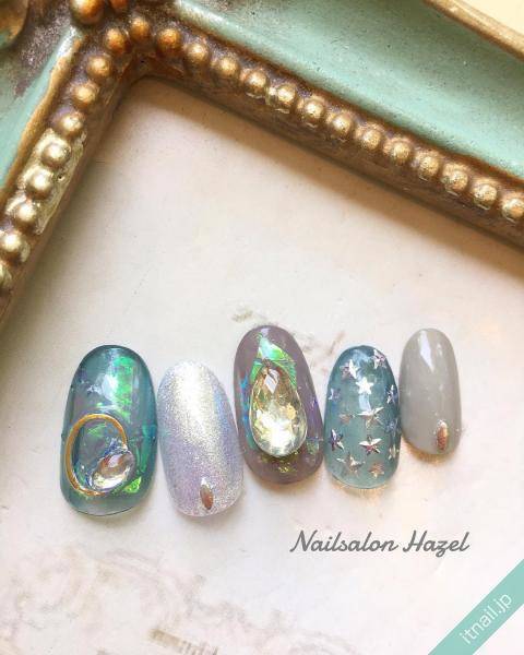 たとえばこんな風にくすんで落ち着かせえたニュアンスアラーは、指ごとに変えて乗せて、オーロラフィルムで仕上げてみて。