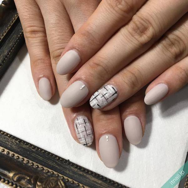 例えば、肌なじみのいいベージュやピンクベージュを使ってアートするデザインはいかがでしょうか。スキンカラーのシンプルネイルを基本に、爪1~2本をツイードデザインにしたり、ツイードネイルのフレンチデザインに仕上げたり。これからの季節は、グレーカラーを基調としたツイードネイルもおすすめです。