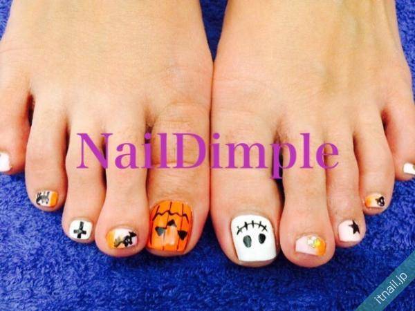 それぞれの爪に違ったモチーフを描くのもかわいいです。カボチャにクモの巣、ドクロや十字架が描かれたフットネイルは、どこから見てもハロウィンテイスト満載の賑やかなデザインですね。