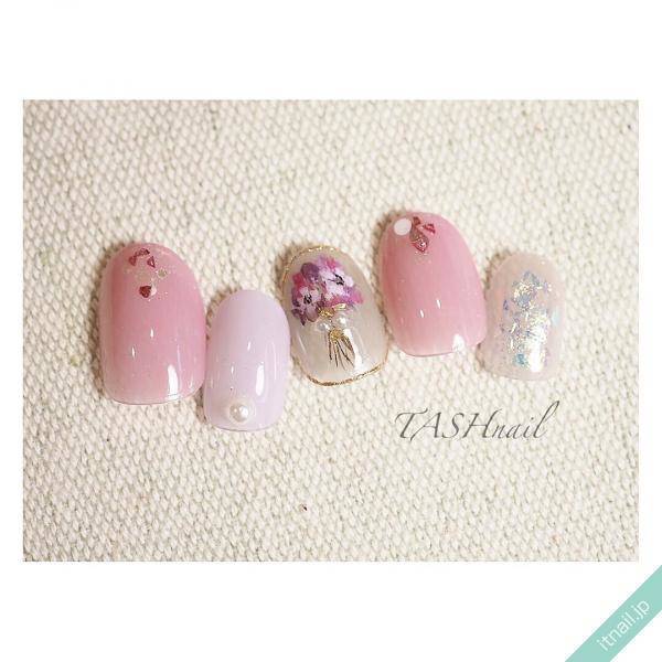 例えば、クリアベースのネイルに純白の花束をアートするデザインはいかがでしょうか。透明度の高いクリアホワイトをベースにホワイトの花束をアートしたり、ベースカラーにピンクを使ったりするデザインも素敵ですよね。パールやストーンをプラスして、上品かつ華やかなネイルに仕上げるアレンジもおすすめです。