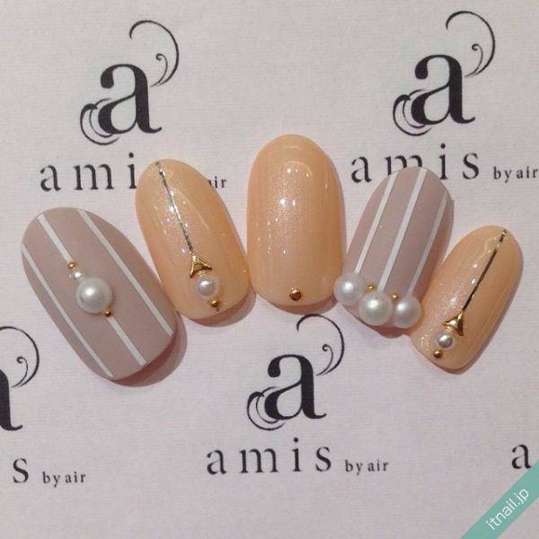 スキンカラーは、ゴールドと相性抜群です。そこで次にご紹介するのが、スキンカラーベースにゴールドのストライプラインをアートしたデザイン。